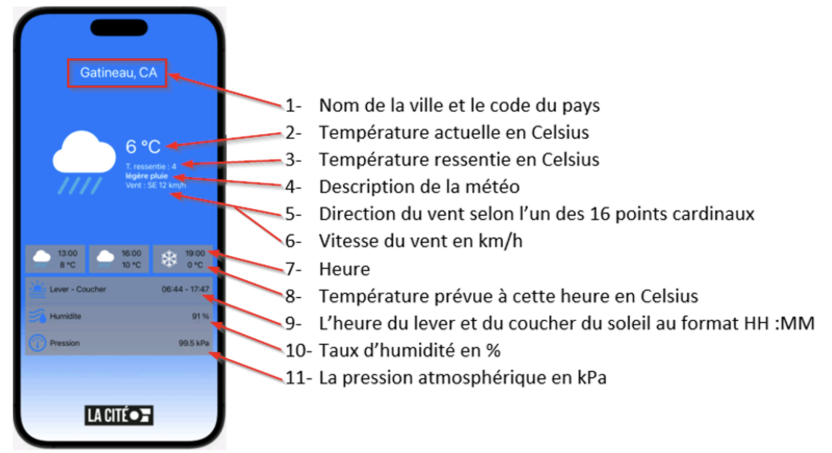À partir de l’application météo que vous pouvez télécharger ci-dessous, intégrez une API afin d’obtenir la météo actuelle. Une clé API vous sera fournie. Cependant, je vous recommande de créer un compte avec votre courriel du collège et d’utiliser votre propre clé API.